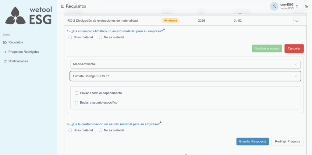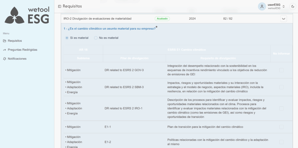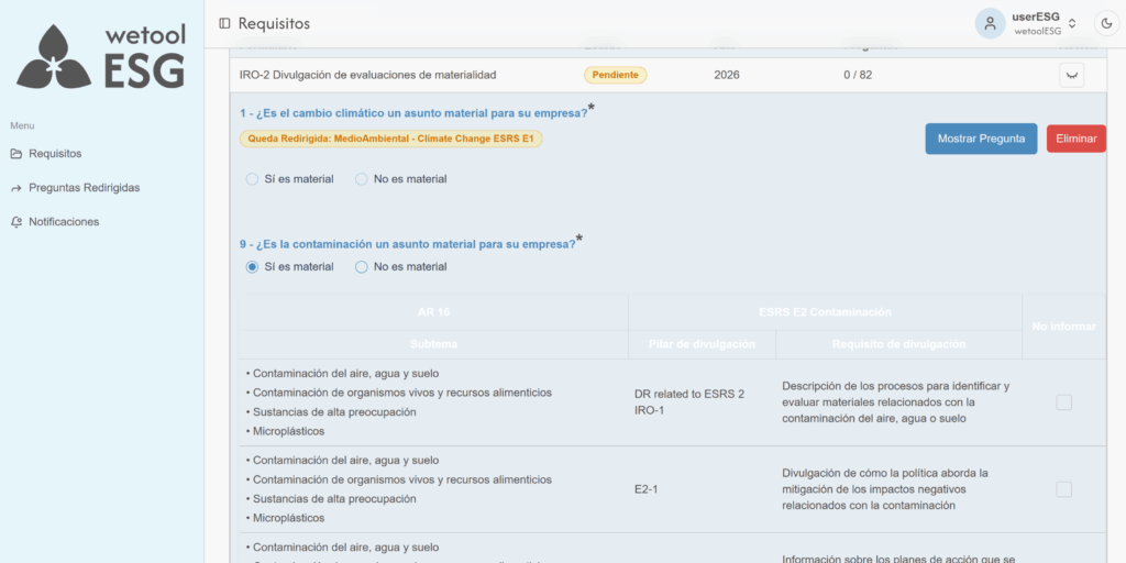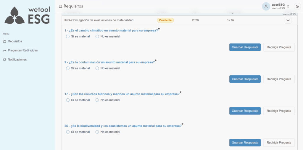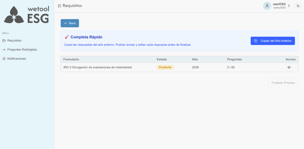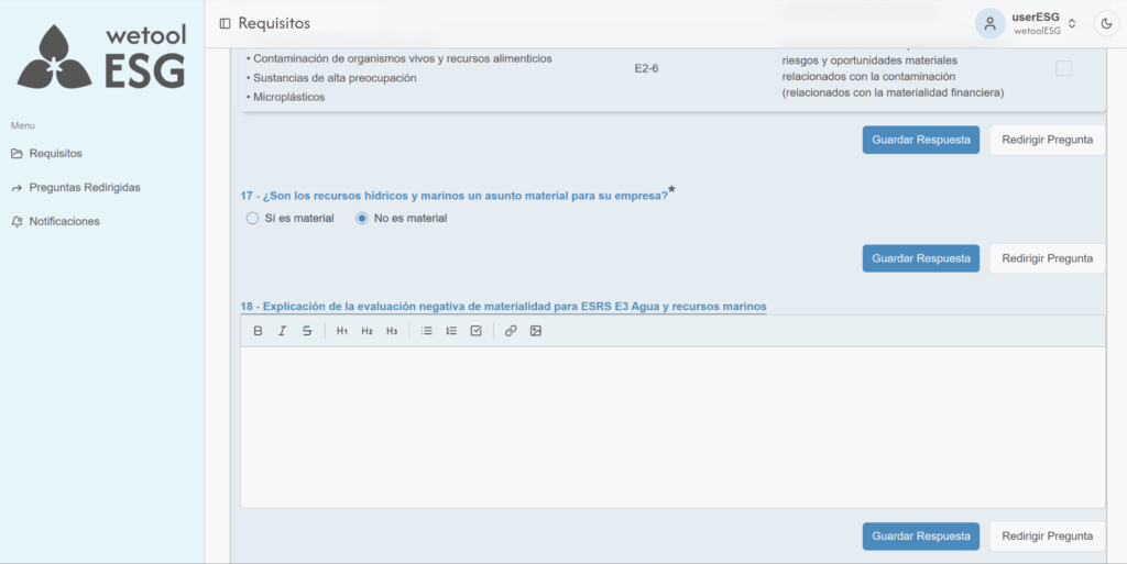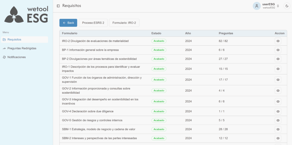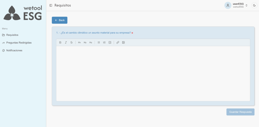 wetoolESG presenta formularios configurados según los requisitos de los estándares de sostenibilidad. La empresa solo debe completar la información solicitada en cada apartado.