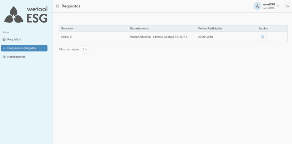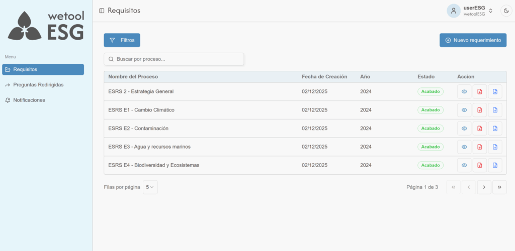 wetoolESG es una herramienta desarrollada para facilitar la gestión técnica de la sostenibilidad en las organizaciones. La plataforma permite integrar los criterios ambientales, sociales y de gobernanza en un único entorno digital, ayudando a las empresas a organizar su información de manera coherente con los marcos regulatorios vigentes. Su objetivo es simplificar el proceso de reporte, asegurando que la transición del dato al informe final sea eficiente y estructurada